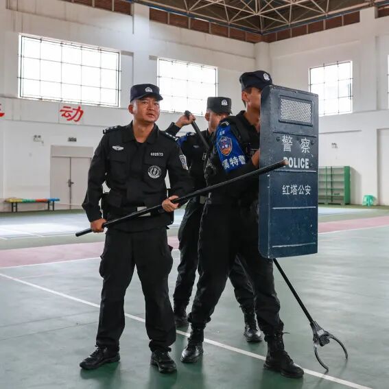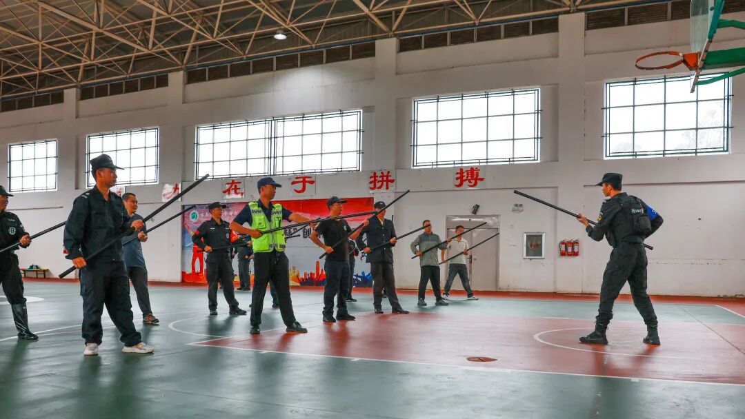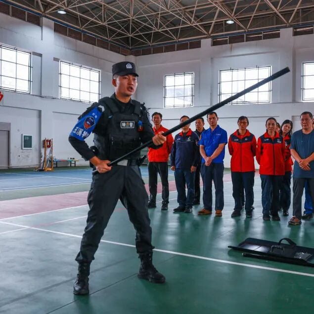 演练伊始,专业人员对安保人员进行了基本技能及防暴器材的系统讲解与实操训练,夯实基础能力。随后,以“校门口突发持刀‘不法分子’试图闯入校园”为模拟场景,迅速拉开实战演练帷幕。当“不法分子”妄图强行突破校门口防护时,安保人员与特警、派出所民警反应迅速,配合默契,成功将“不法分子”制服,并移交民警带离现场,整个处置过程紧张有序、高效专业。