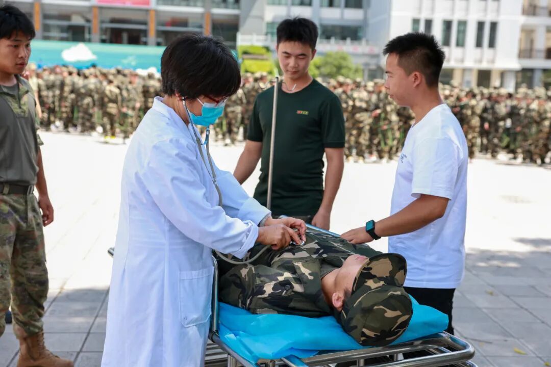 在紧急救护环节,校医团队接到“学生被砸伤”的模拟报告后,携带急救箱赶赴学生公寓“受伤点”,对“腿部骨折”“头部擦伤”人员进行模拟包扎、固定,并通过担架将其转移至立德广场临时医疗区,完整呈现了应急救护的全流程。