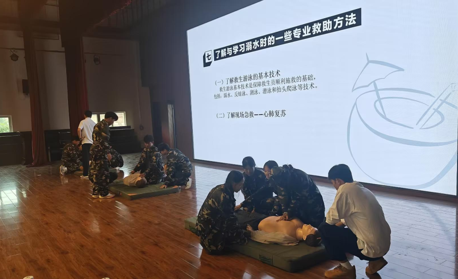 随后,学生组队模拟溺水场景下的呼救与现场急救,并使用模拟人进行心肺复苏(CPR)等实操演练。